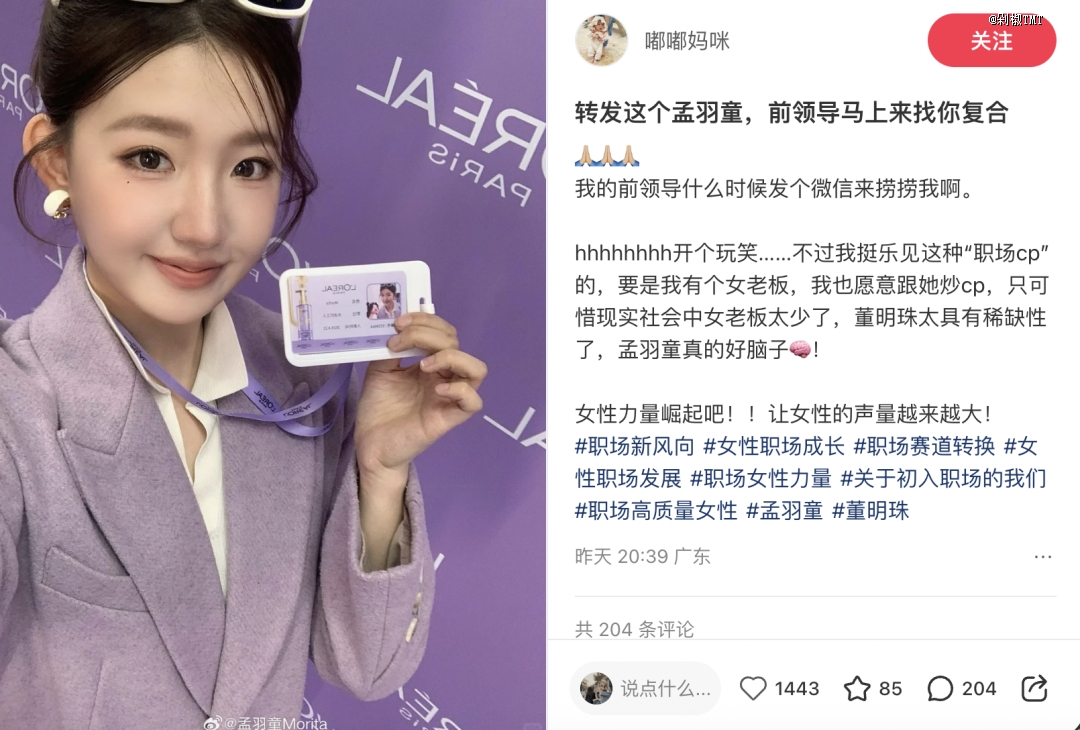“她到哪都不会差,但格力给了机会,抓住了就对了,不一定回去上班,但也要懂得借势。这女孩简直是吾辈楷模,能屈能伸,业务能力强,情商高,抗压能力强。”一位支持孟羽童的网友表示。