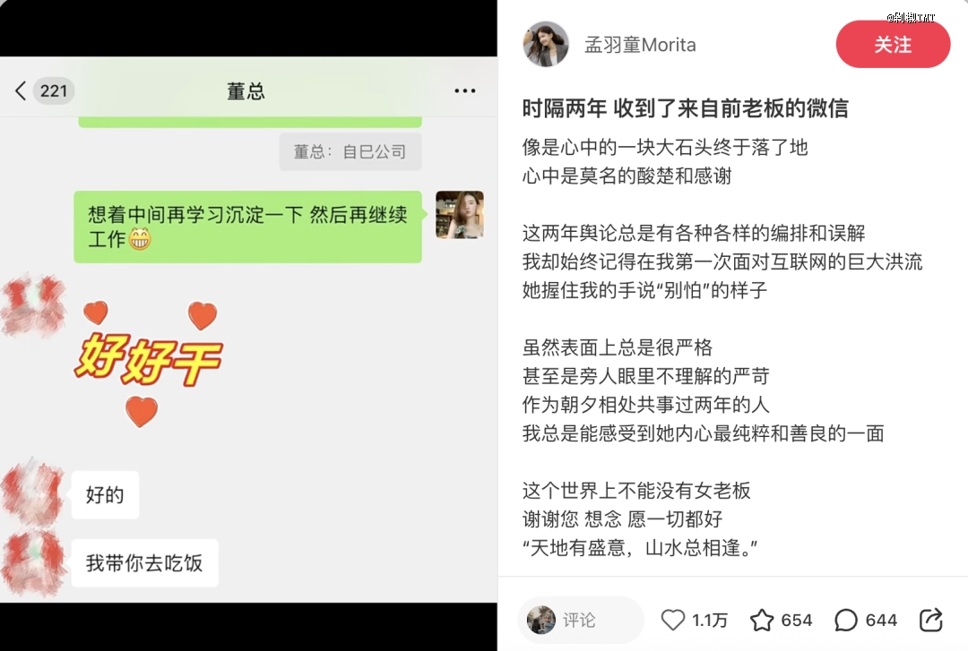 此次二人破镜重圆的契机是,在520节日当天,也就是直播开启三天前,孟羽童在社交媒体账号上晒出了自己和董明珠的聊天记录。她表示,“时隔两年收到了来自前老板的微信,像是心中的一块大石头终于落了地……这个世界上不能没有女老板”<_o3a_page>