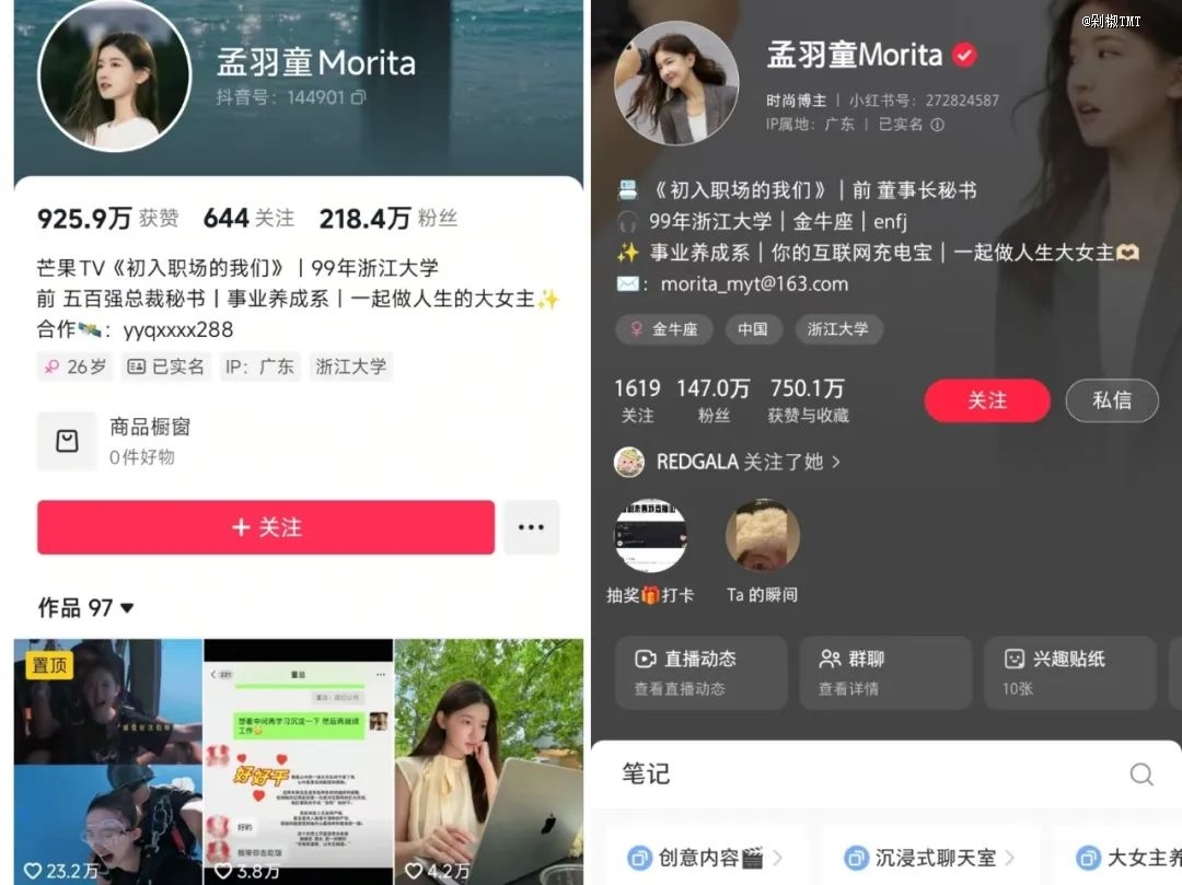 离开格力之后的孟羽童,顶着“前五*总裁秘书”的头衔,网红之路发展的顺风顺水。据公开报道显示,孟羽童账号的广告的价格在离职后直接涨到了每条20万,短短半年就赚了上千万元。当前孟羽童的抖音账号粉丝已经达到了218.4万,小红书账号粉丝亦高达147万。
