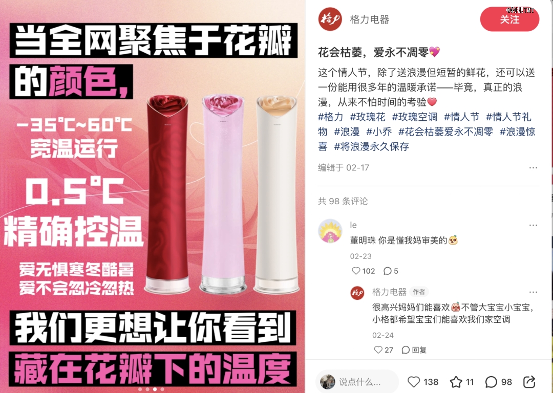 在直播间里,她还表达了对玫瑰空调二代的展望,称新一代产品可能将整个空调外形做成玫瑰花的形象,成为一件摆放在家里的艺术品。