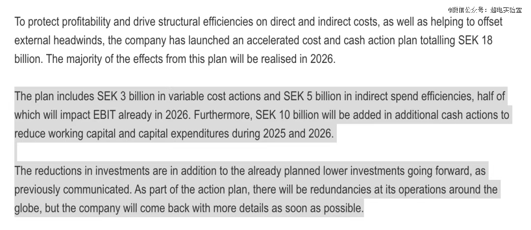 这项计划主要分成了三个部分,其一是通过优化采购流程、提升供应链效率以及改进生产效率来实现削减30亿瑞典克朗的可变成本;二是缩减50亿瑞典克朗的间接支出,具体措施为缩减研发、行政以及市场方面的费用;最后是通过减少资本开支以及降低营运资本占用等方式,保证实现100亿瑞典克朗的现金流管理。
