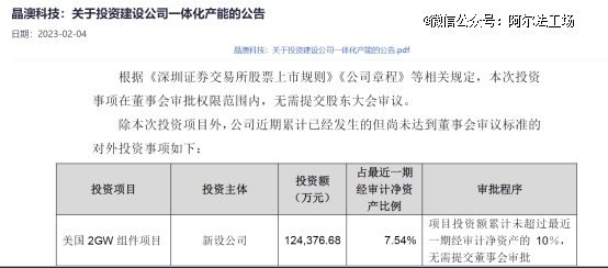 两年前,2023年2月4日,晶澳科技公告称,将通过新设公司的方式在美国亚利桑那新建2GW组件项目,投资额约为12.44亿元人民币。