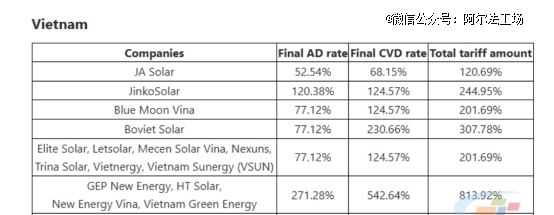 其中,晶澳的越南工厂将被征收52.54%的反倾销税和68.15%的反补贴税,合计征收税率高达120.69%。