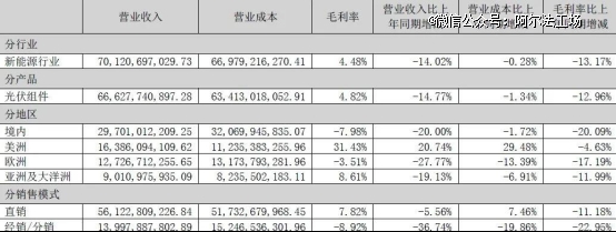 晶澳科技的成本控制能力,曾被认为是全行业之首。但其中国境内与欧洲市场的毛利率,不仅皆为负数,还出现了营业收入和毛利率全部同比下降。