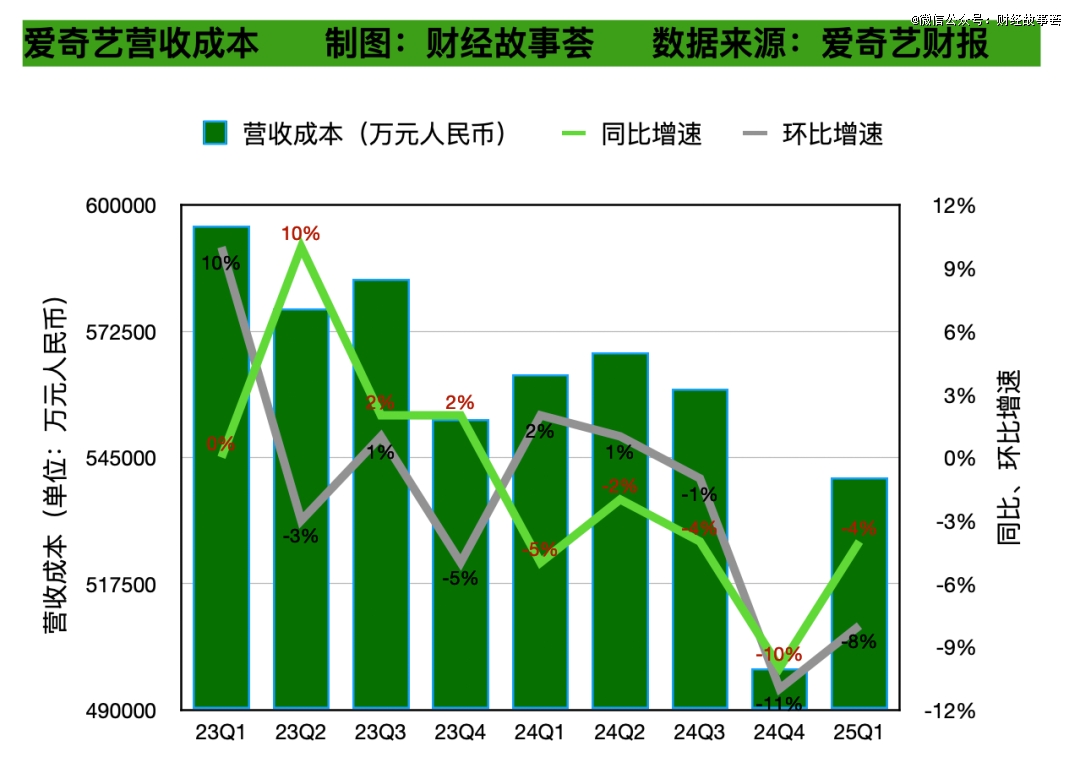 今年Q1,爱奇艺营收总成本 54.1 亿元,同比下降 4%,内容成本 37.9 亿元,同比下降 7%,公司表示这主要得益于内容策略的改进以及季度内电影供应较少。