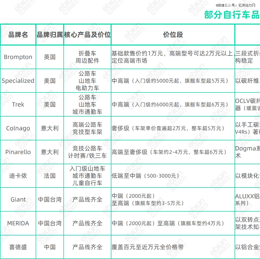 除了小布,中国市场上的主流自行车品牌,以海外品牌为主,包括国际品牌品牌Specialized(闪电)、Trek(崔克)、Colnago(梅花)、Pinarello( 皮纳尔)、迪卡侬等,以及中国台湾品牌Giant(捷安特)、MERIDA(美利达),还有中国品牌喜德盛。