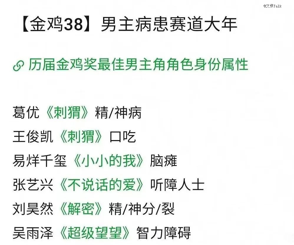 最近有网友预测第38届金鸡奖最 佳男演员提名,发现了一个有趣的现象——今年上映电影里,男演员们不约而同地选择了各类特殊群体角色。