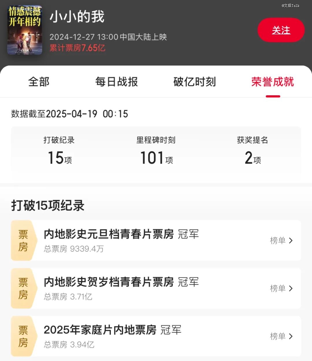 哪怕是经济下行的前两年,《我们一起摇太阳》虽然撤出春节档,但二轮上映后票房都能达到2.74亿,吊打同样撤档又上映的《红毯先生》(9364万);《小小的我》在惨淡的贺岁档上映,7.65亿的票房可能拿到易烊千玺一番的电影里不算出彩,但绝 对给中国电影市场打了一剂强心剂。