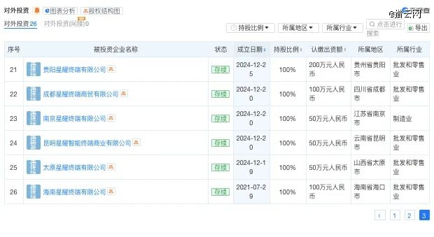 相隔不久,自2024年12月19日起,荣耀全资子公司深圳星耀终端有限公司就开始密集进行对外投资,在太原、成都、南京星耀终端有限公司、昆明等地设立子公司,迄今共新开25家新公司,经营范围均包含可穿戴智能设备、智能机器人、智能无人飞行器等多个前沿科技领域。