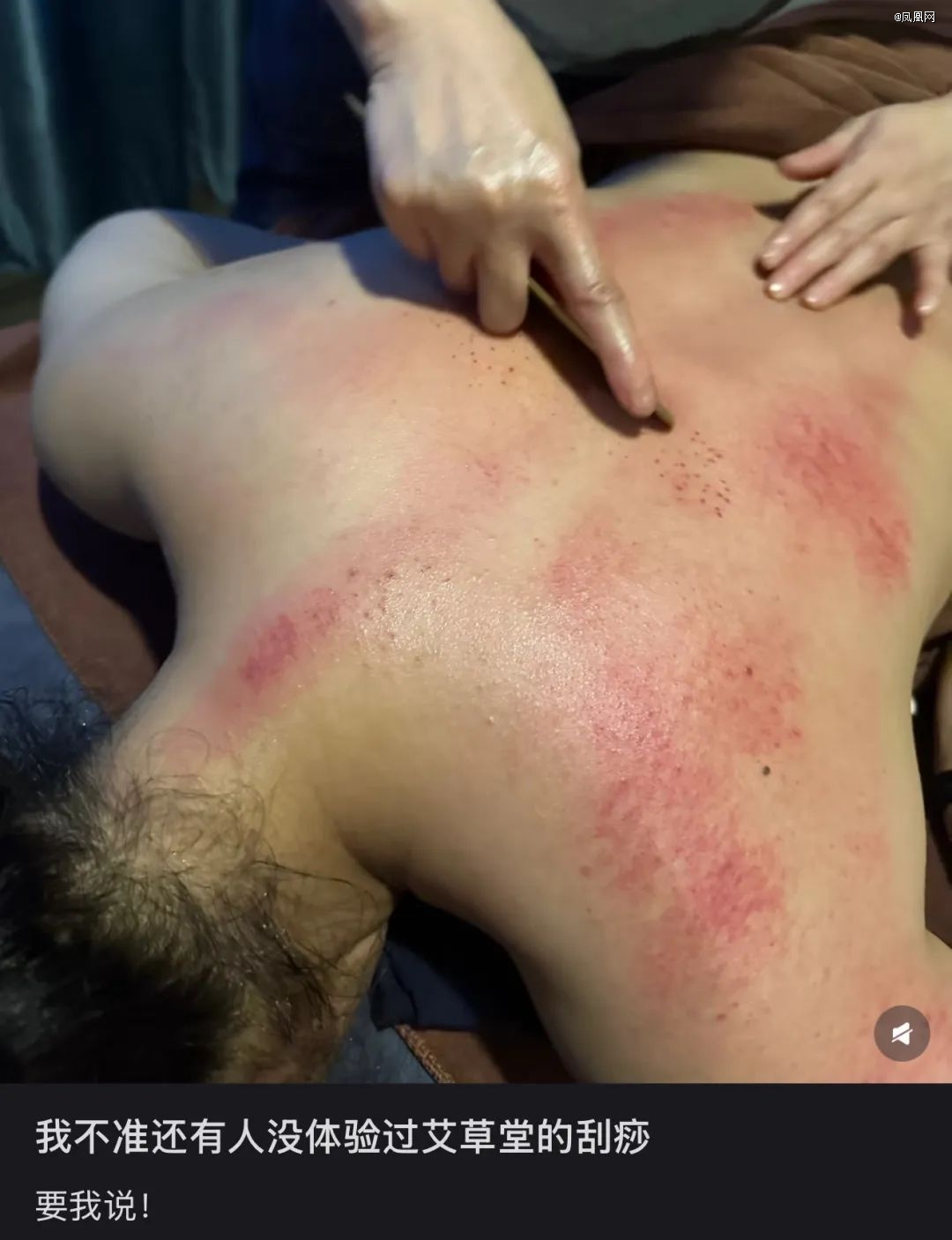 理疗店里,被艾绒布包裹的小刮片铮铮作响,体验的顾客吱哇乱叫,配合前文的“杂技艾灸”,简直组成了:一套艾草大刑。
