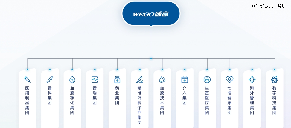 进一步细分之下,“威高系”下包含了12个业务集团体系,包括威高医用制品集团、骨科集团、血液净化集团、普瑞集团、药业集团、精准外科诊疗集团、血液技术集团、介入集团、生基医疗集团、七福健康集团、海外管理集团和数字科技集团。