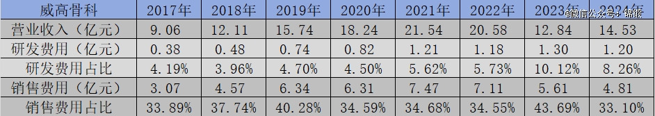 威高骨科身上,存在着与威高股份相同的“营销驱动”的问题。2023年之前,威高骨科的研发费用占比从未超过6%,而销售费用却始终在30%以上。缺乏产品创新,这是致使威高骨科预期低于行业的核心因素。