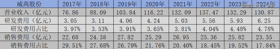 回顾这些年威高股份的业绩,尽管在营收规模持续攀升的带动下,企业销售费用占比已经降至20%以下,但与常年不足5%的研发费用相比,依然呈现出“营销驱动”的典型特征。
