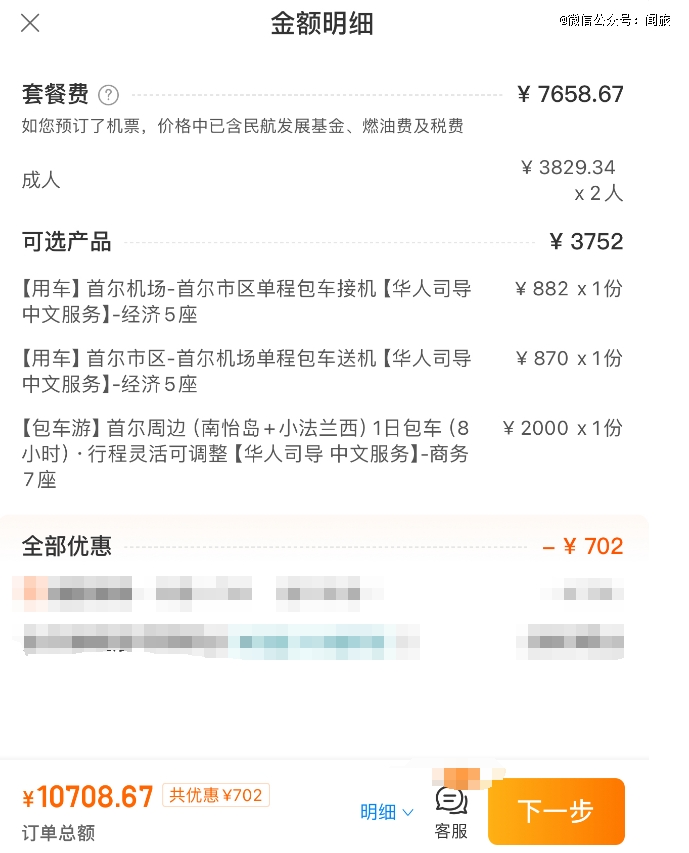 而同时间段北京至首尔单纯机+酒三晚四天自由行产品价格两人出行基本在7000元左右,首尔市区或者周边一日包车8小时价格2000元左右,当地包车接送机单程价格在900元左右,整体花费大约在11000元。