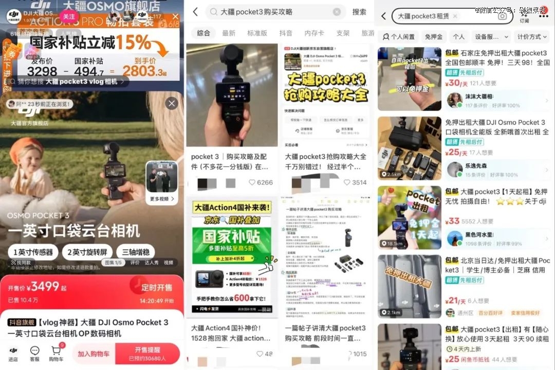 线上纯靠手速抢、线下预定1个月起......去年年底开始,大疆Pocket 3成为新一轮的“电子茅台”,引大量消费者的蹲守抢购。供不应求下,不少消费者甚至转而寻找海外代购,社交平台还有大量抢购指南,详细到不同平台的好抢程度、补货时间、售后、价格优势等等。提前抢到的消费者顺势在二手平台做起了租赁交易,平均价格在35元左右/每天。