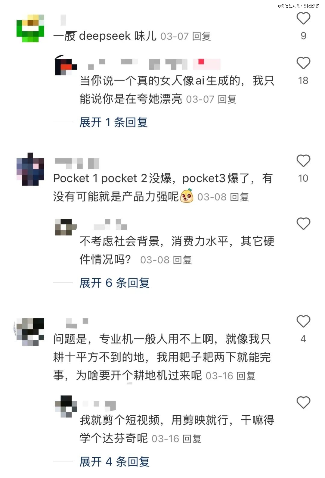 “谁爱拔谁拔,我拔不了一点”、“租了一个,立刻去买了”、“你这文案一股deepseek味儿”......很多拔草贴子下面,都能看到不少粉丝的捍卫,还顺手带着大疆出品的Live图。对于部分认为出品一般的评论,粉丝们只会觉得“是你的参数没设置好”。