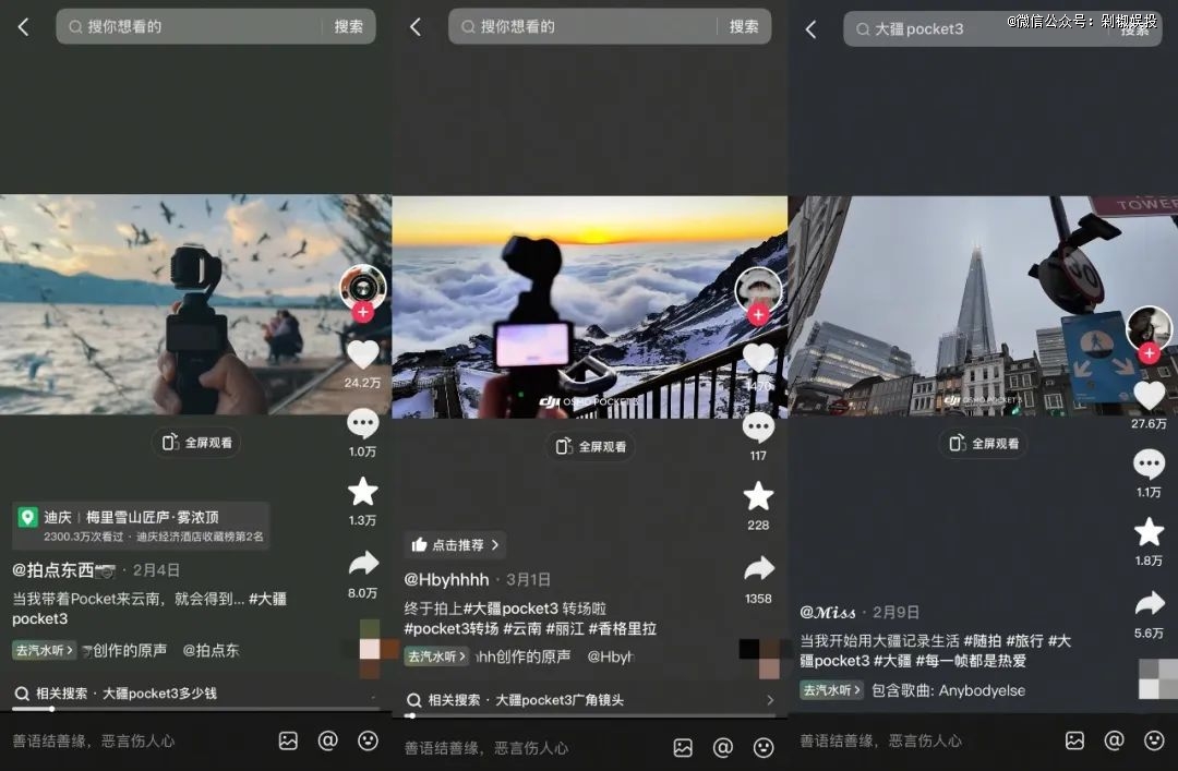 相比2.0版本,第三代的确在技术上了“挤爆了牙膏”。但真正使其风靡于社交平台背后,离不开大疆在种草、营销上的一次突破。