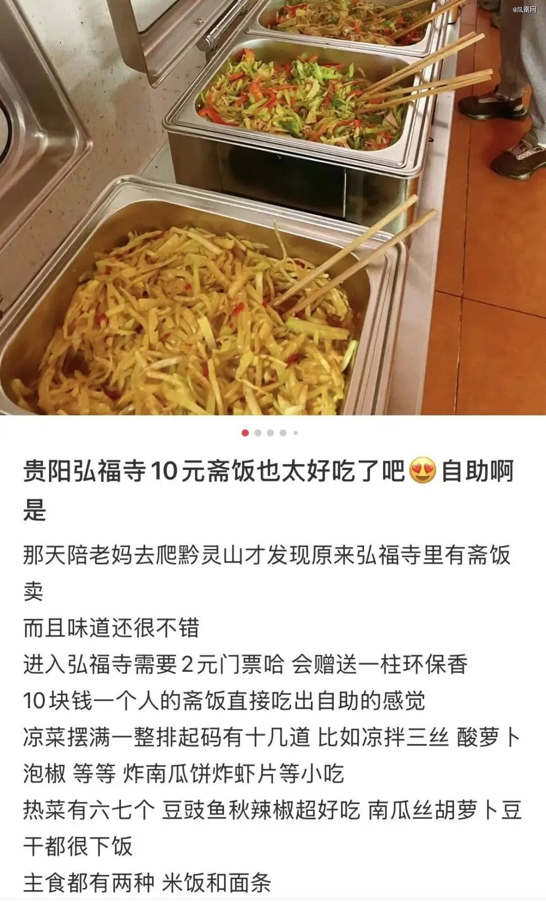 网友@Ann去了贵阳的弘福寺后,感叹十块钱吃出了豪华自助餐的体验——凉菜十几个,热菜六七个,汤三四种,连主食都有米饭和面条两种选择。