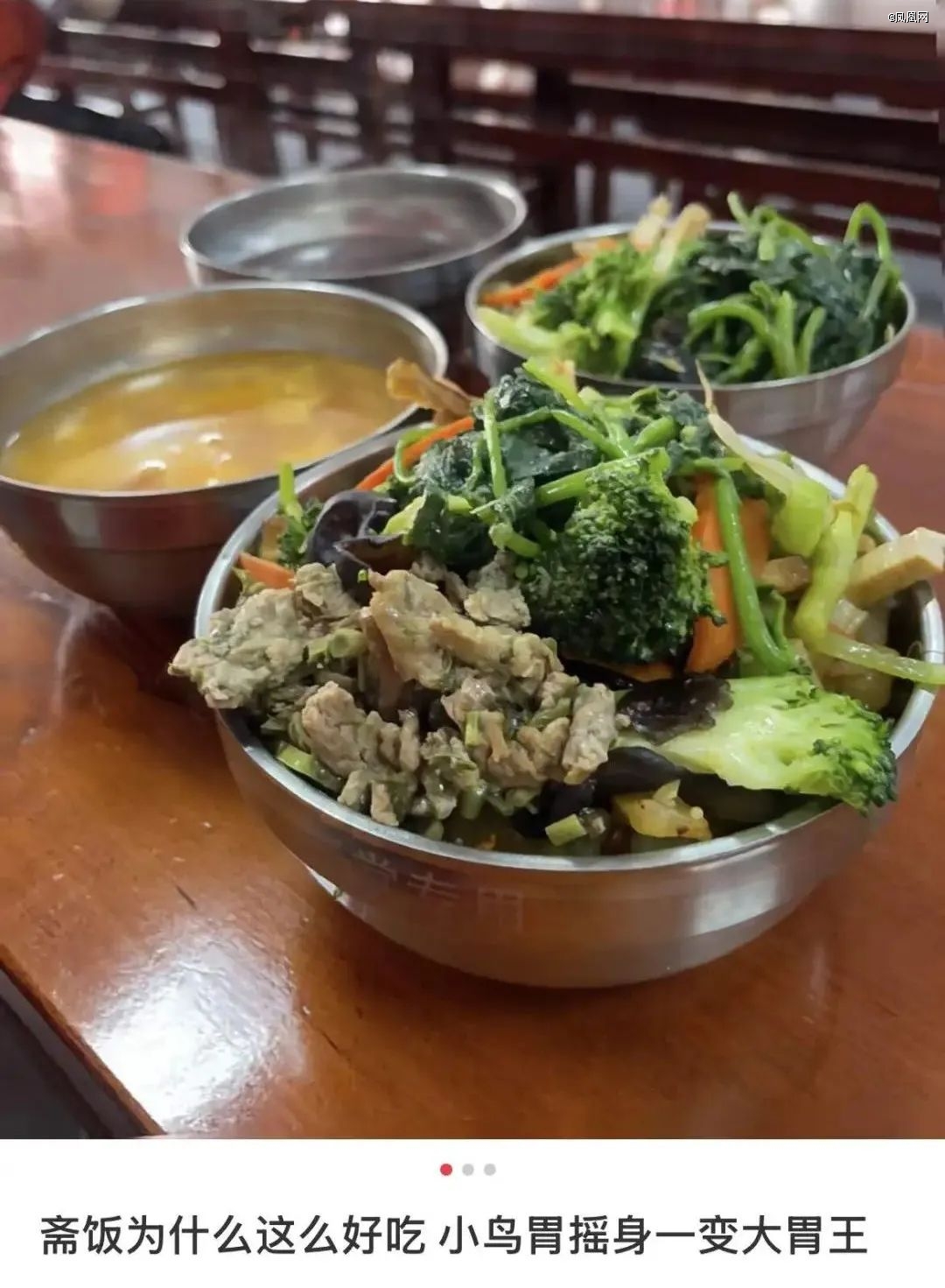 天天念叨着无肉不欢的打工人,一到寺庙却像老鼠掉进了米缸,在蔬菜和碳水的包围下吃得饱嗝连连。
