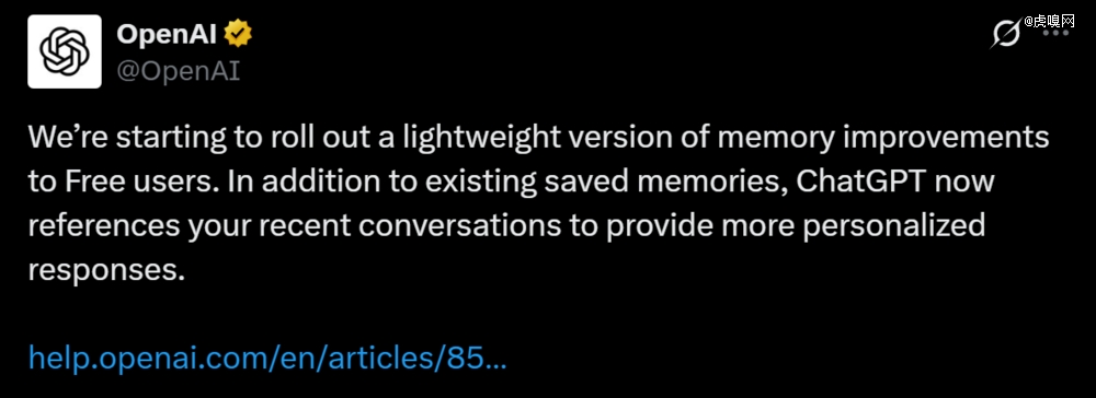 北京时间6月4日,OpenAI又宣布向免费用户推出记忆功能改进的轻量级版本。据介绍,除了现有的已保存记忆外,ChatGPT还会参考用户近期的对话内容,以提供更个性化的回复。