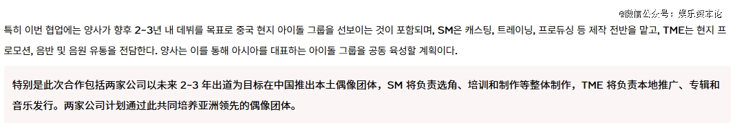 2)2.0版的EXO要来了?5月末,HYBE刚刚官宣在北京成立分公司HYBE CHINA,将聚焦协助旗下艺人来华活动。而在SM官网上,SM表示两家公司以未来 2~3 年出道为目标在中国推出本土偶像团体,SM 将负责选角、培训和制作等整体制作,TME 将负责本地推广、专辑和音乐发行。两家公司计划通过此共同培养亚洲*的偶像团体。