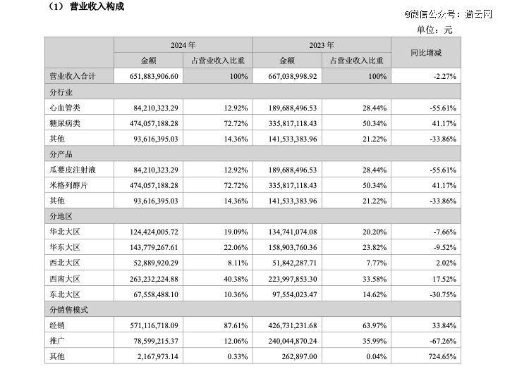 其中,易明医药的核心产品米格列醇片,在我国治疗2型糖尿病的米格列醇制剂市场中,所占的市场份额连年稳居首位。2024年报显示,易明医药米格列醇片收入约4.74亿元,占营业收入比重高达72.72%;瓜蒌皮注射液收入约8421.03万元,占比为12.92%。