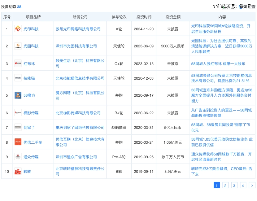 天眼查App信息显示,58同城迄今共对外投资(或并购)38起,目前管理北京五八信息技术有限公司、天津五八到家生活服务有限公司两家基金,另有12起对外投资基金记录。