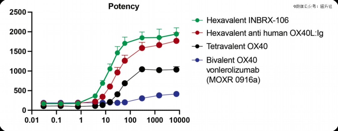 这大概就要从底层的机制说起了。OX40的配体OX40L是三聚体性质,因此开发的话,将抗体开发成六价的构型,更接近天然的OX40-OX40L的结合方式,更加有利于抗体与多个OX40分子结合。而这就是此前绝大多数OX40抗体开发的问题所在:大多数早期研发机构将OX40抗体设计成了二价或者四价抗体激动剂,不适合有效的受体集群,因此无法在癌症治疗中取得令人免疫的疗效反馈。