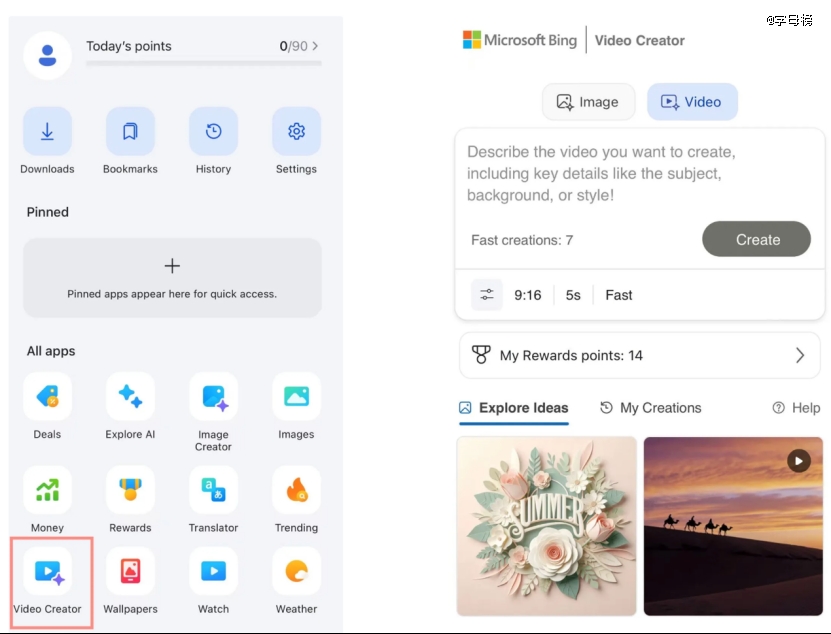 前天,微软Bing宣布在其应用程序中推出 Bing 视频创作器(Bing Video Creator),该功能基于OpenAI的Sora模型,允许用户通过文本提示词生成视频。这也是Sora首次面向用户免费开放。