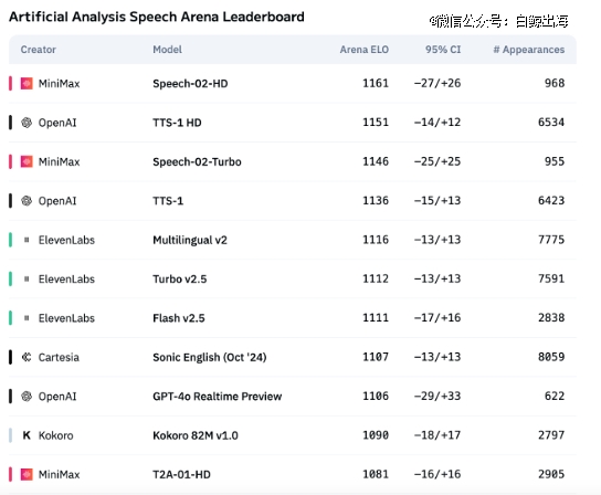 时隔一段时间,4 月 12 日,MiniMax 上线最新版本语音生成模型 Speech-02,而在 5 月 15 日,系列模型中的 Speech-02-HD 同时登顶了 Artificial Analysis Speech Arena 和 Hugging Face TTS Arena 两大榜单,技术指标上 Speech-02-HD 不仅在错字率、声音相似度等客观指标上*竞品,在主观的盲听测试中,也取得了相当不错的成绩。