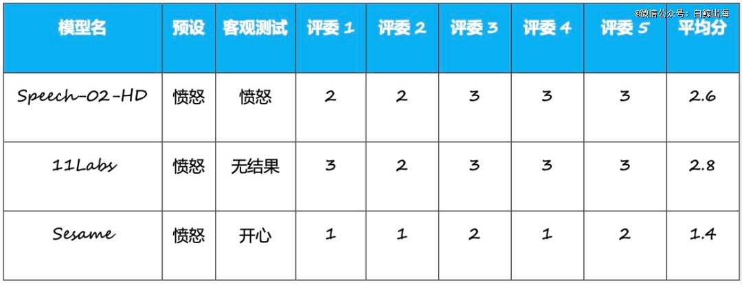 注 1:受试产品(模型)中,MiniMax、DubbingX、ElevenLabs、Sesame 均通过各自官网生成测试语音,阿里的 CosyVoice2 由于是开源模型,所以使用接入了 CosyVoice2 的第三方平台“书梦”。