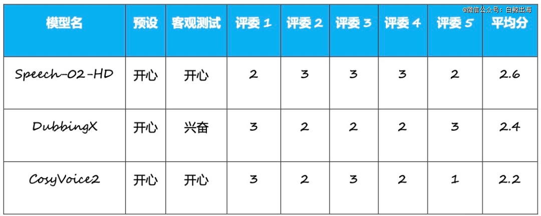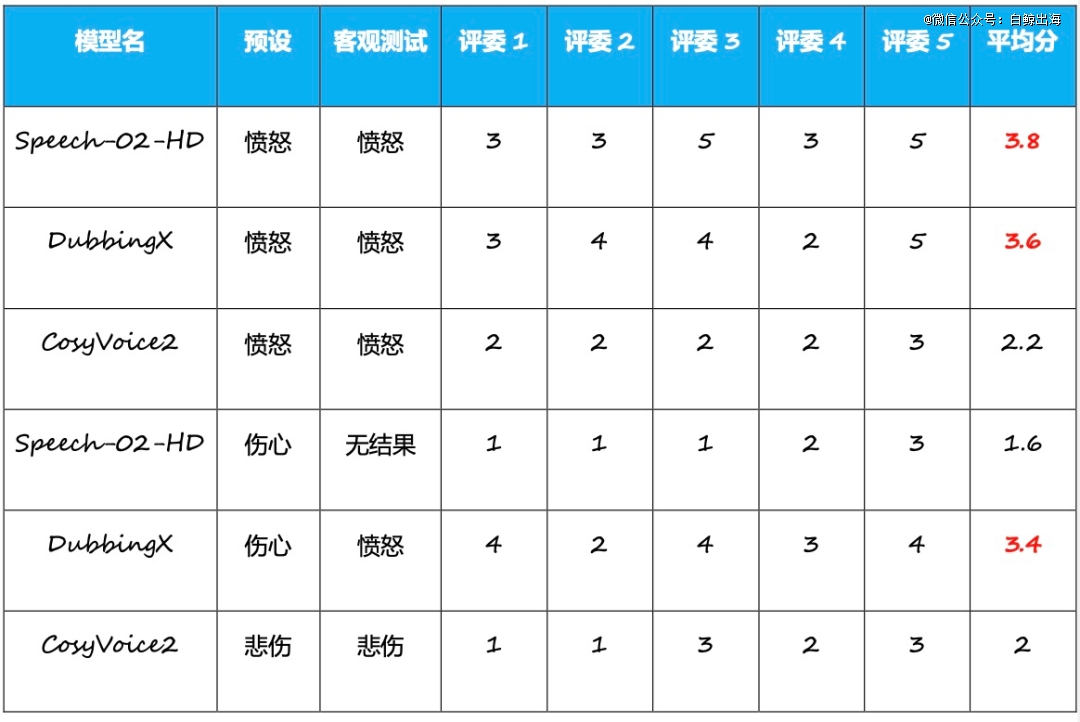 从结果看,愤怒情绪当中,三款产品都通过了客观测试,主观测试中也仅有 CosyVoice2 的平均分低于三分,而从海螺、DubbingX 两款模型表现看,笔者认为是显著优于上一次测试的,这两款模型都能将林冲层层递进的愤怒情绪还原出来,虽然与真人仍有差距,但应该已经到了“能用”的地步了。读者们也可以自己听一听几款产品的表现,来给他们打打分。