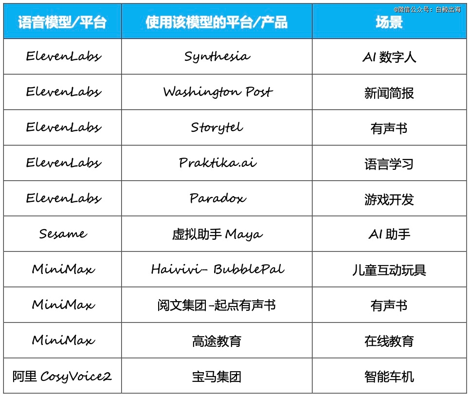 注:本表只涉及几款AI语音产品官方宣布的技术合作