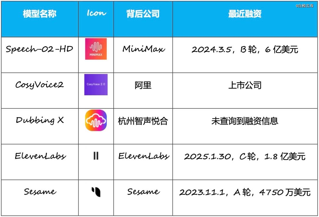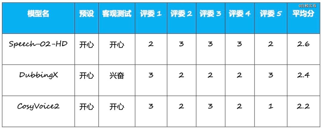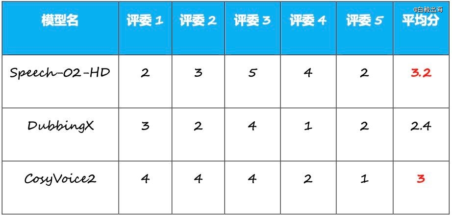 注 1:受试产品(模型)中,MiniMax、DubbingX、ElevenLabs、Sesame 均通过各自官网生成测试语音,阿里的 CosyVoice2 由于是开源模型,所以使用接入了 CosyVoice2 的第三方平台“书梦”。