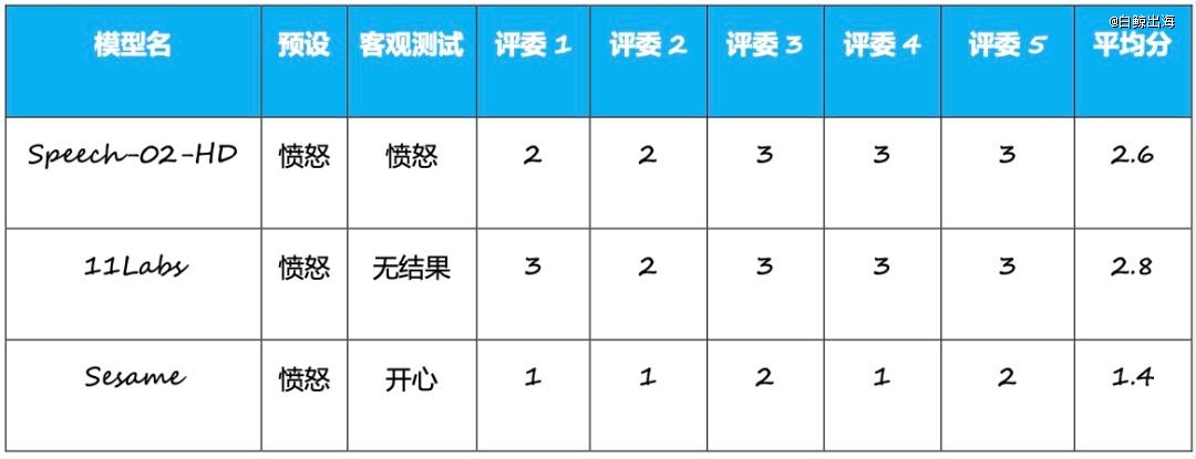 在英文有声书的场景,三款模型表现得有些拉胯,均没有体现出强烈的愤怒情绪与气势,三款产品在主观测试中均没有过 3 分的及格线。而且由于 ElevenLabs 和 Sesame 的官网中都没有“情绪标签”功能,AI 的输出要更差一些,甚至都没有通过客观测试。