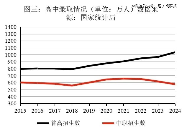 近些年,国内高中阶段毛入学率不断提升,2024年已达到92%。在这个过程中,普高和中职的发展走势呈现出较大差异。