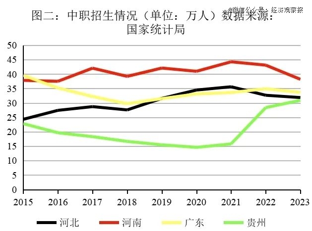 国家统计局数据显示,2022年贵州中职学校招生数异军突起,由前一年的15.8万升至28.4万,2023年进一步升至30.9万。而同一时期,普高的招生数变化不大。受此影响,2022年贵州普高招生数占“普高招生数+中职招生数”的比例,从67.8%骤降至52.1%。