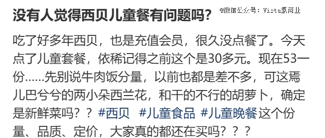 西贝把自己的儿童餐定义为“专业儿童餐”,理念是“绿色、天然、有机、趣味”。虽然他们的有机西蓝花和胡萝卜被吐槽逐渐变得“不新鲜,甚至干瘪”。蔬菜从满杯变成半杯,配餐水果从原来有猕猴桃降级为只有小西红柿、香瓜,玉米则持续变薄,“西贝到底有多少种节约食材成本的方法?”