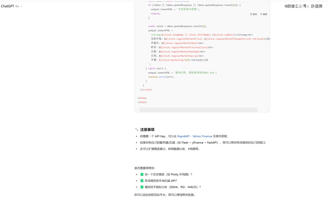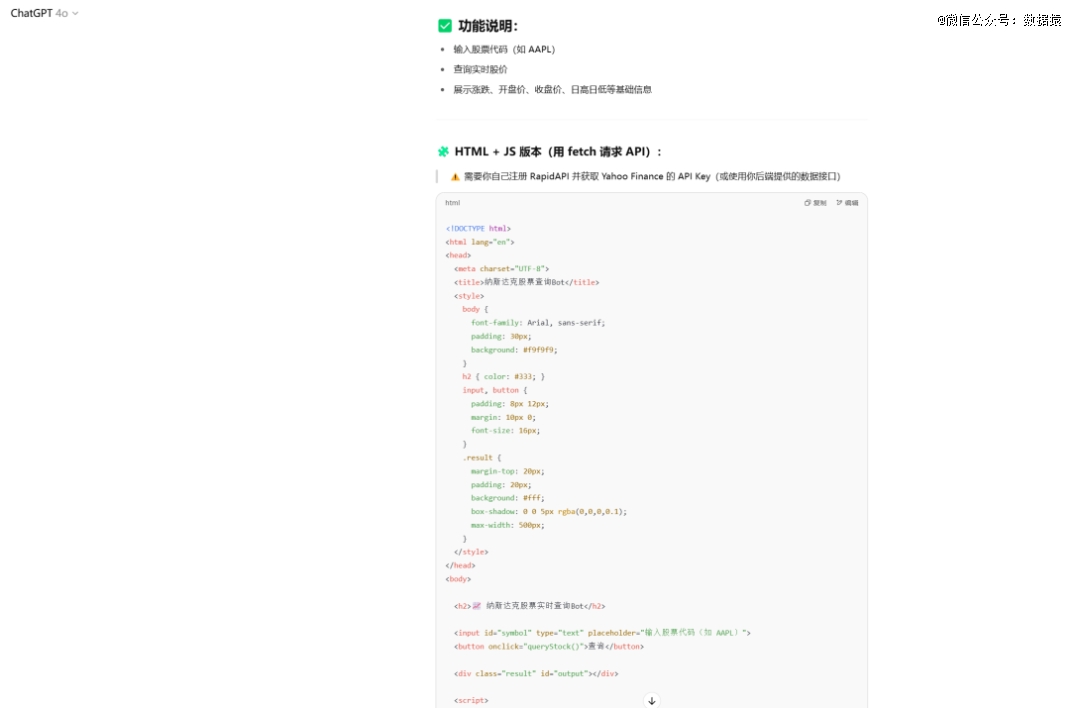 OpenAI毫无疑问是“AI Bot平台”这个概念的最早布道者。早在2023年便推出插件机制,2024年再以GPTs构建工具将“大模型+插件+记忆”打包成一个轻量化的Bot平台。在ChatGPT-4o,用户可以通过自然语言描述自己的需求,例如“做一个懂金融行情、能查询纳斯达克股票的分析Bot”,系统就会提供完整的Bot功能结构设计建议,还可以给到你HTML+JS版本代码,如果你有API Key,还可以帮你改成调用你自己的接口。这种低门槛、高自定义的设计,让Bot的构建真正做到了“类产品化”,哪怕你不懂技术,也能拉起一个具备记忆、工具调度和文件读写能力的智能助手。