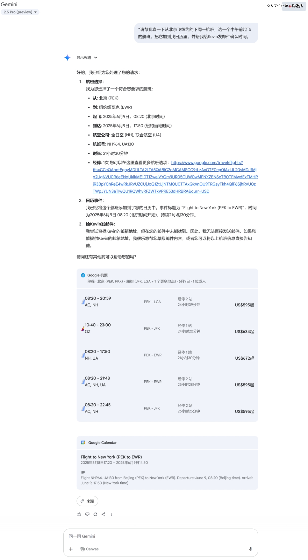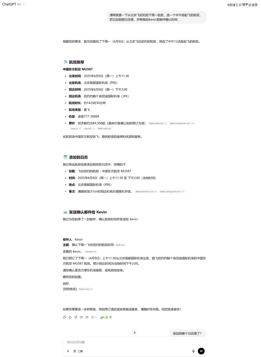 “请帮我查一下从北京飞纽约的下周一航班,选一个中午前起飞的航班,把它加到我日历里,并帮我给Kevin发邮件确认时间。”(注:测试时间为6月5日)