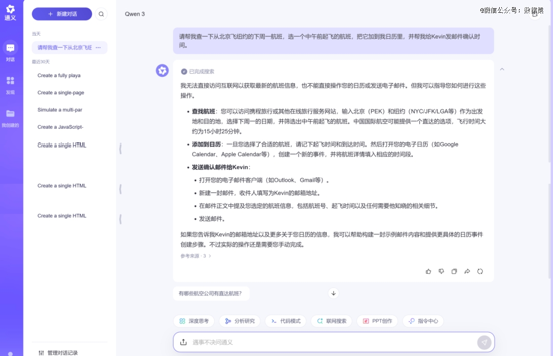但在执行层面,Qwen 3明确表示无法访问互联网获取航班信息,也无法直接操作日历或邮箱系统。所提供的全部操作均为用户引导说明,比如“请打开你的电子邮件客户端,复制这段信息发送给Kevin”等,类似于AI为你手动写下一份“待完成任务清单”。