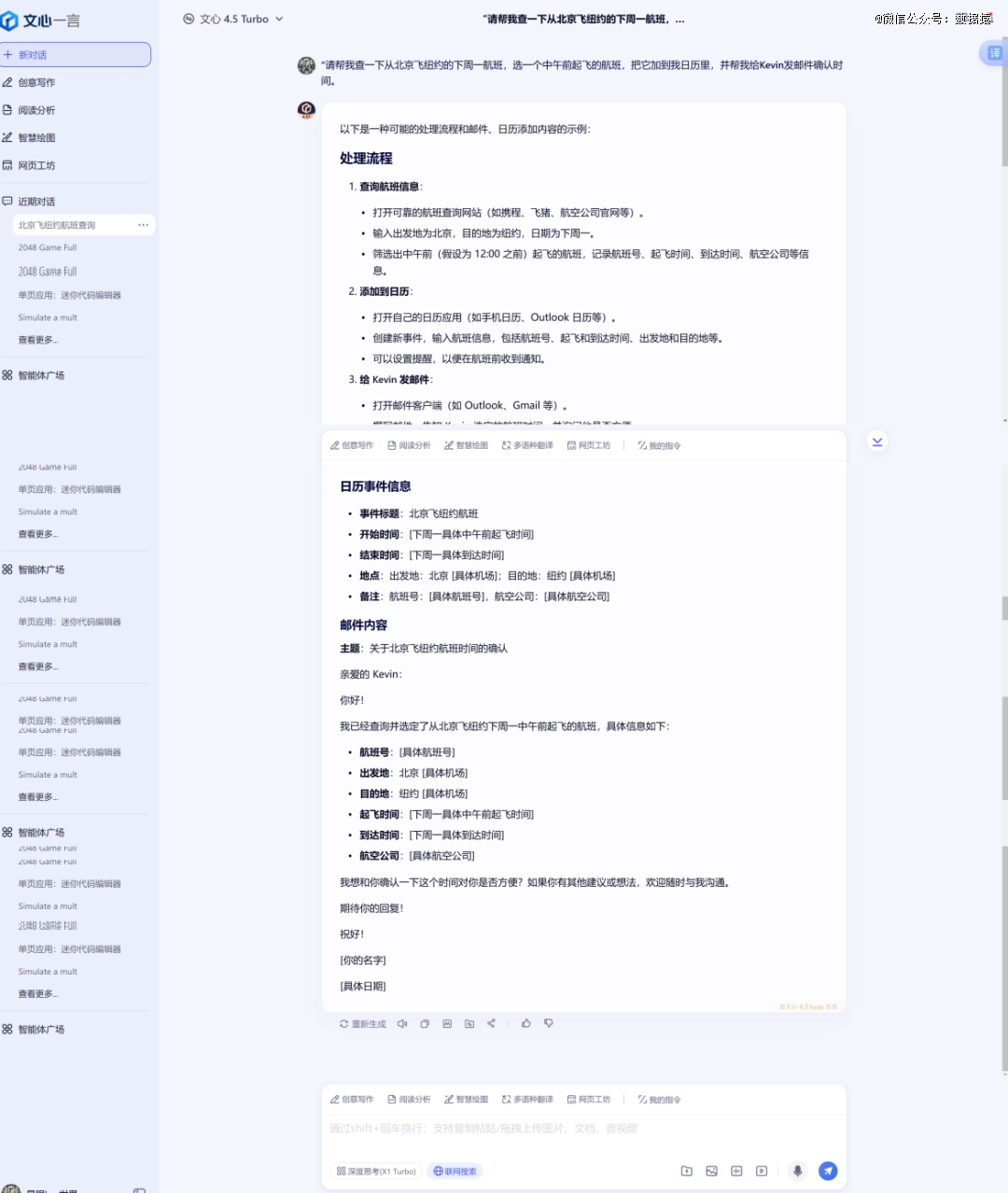 文心4.5 Turbo能够准确理解用户指令,将任务拆解为“查航班、加日历、发邮件”三步,语言逻辑清晰,格式也规范。但所有内容均为模板生成,未提供真实航班信息,日历和邮件也只是文本草稿,不能直接执行操作。与此同时,没有调用任何航班数据源,也无法实际添加日历或发送邮件。所有步骤停留在模拟状态。