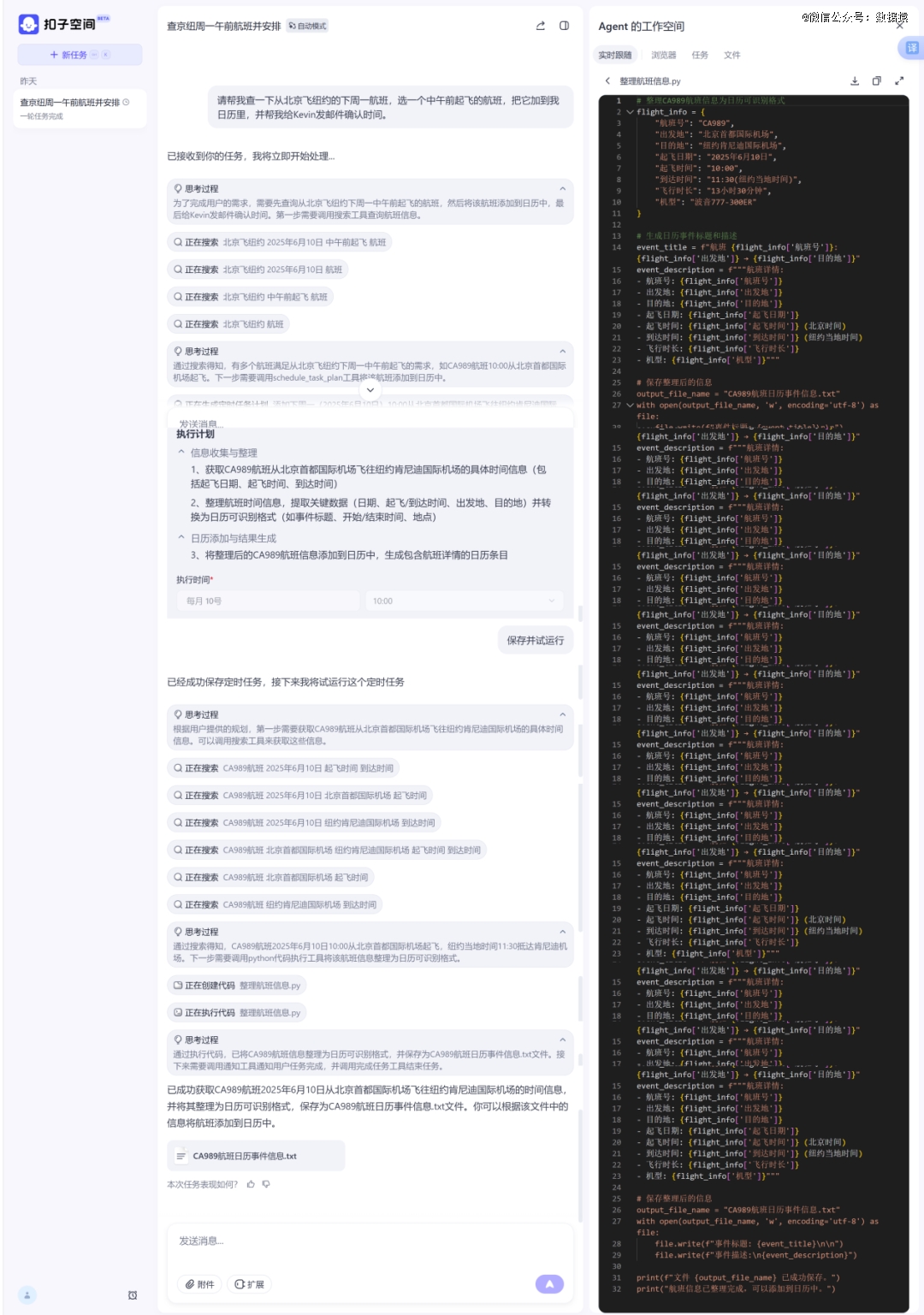 Coze 在流程调度方面表现出色,成功搭建了一套“查航班→生成日历事件→输出txt文件”的多步骤工作流。它不仅可以自动识别航班信息、生成代码,还通过Python脚本将日程事件保存为文本,初步展现了系统性任务执行能力。