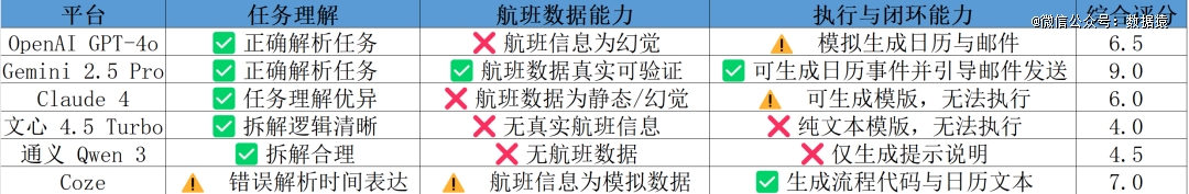 其中,Gemini 2.5 Pro在信息准确性和流程连贯度上*,展示了AI Bot“从理解到行动”的初步路径;Coze具备较强的工作流和代码生成能力,是国内平台中最接近“实用派Bot”的代表;而其他平台如GPT-4o、Claude、文心、通义等,尽管语言理解出色,但在系统连接、工具调用上仍显不足。