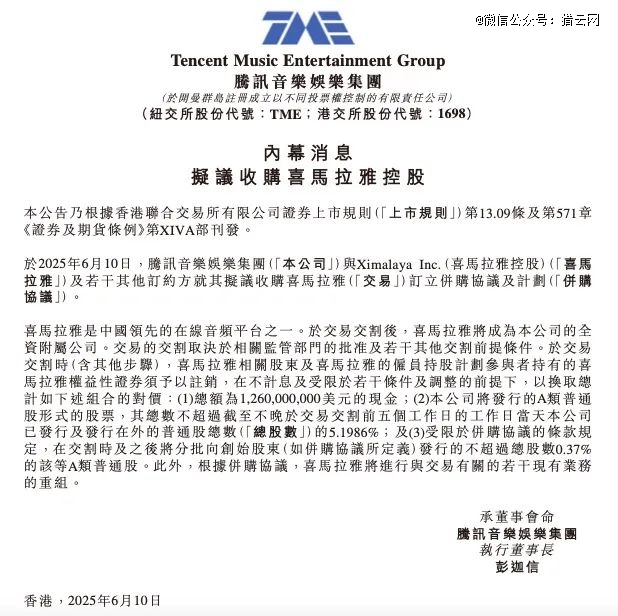 6月10日晚,腾讯音乐娱乐集团(以下简称:腾讯音乐)发公告称,与喜马拉雅签署并购协议,计划以现金12.6亿美元(约合90.6亿元)及腾讯音乐相关股权组合,全面收购喜马拉雅。