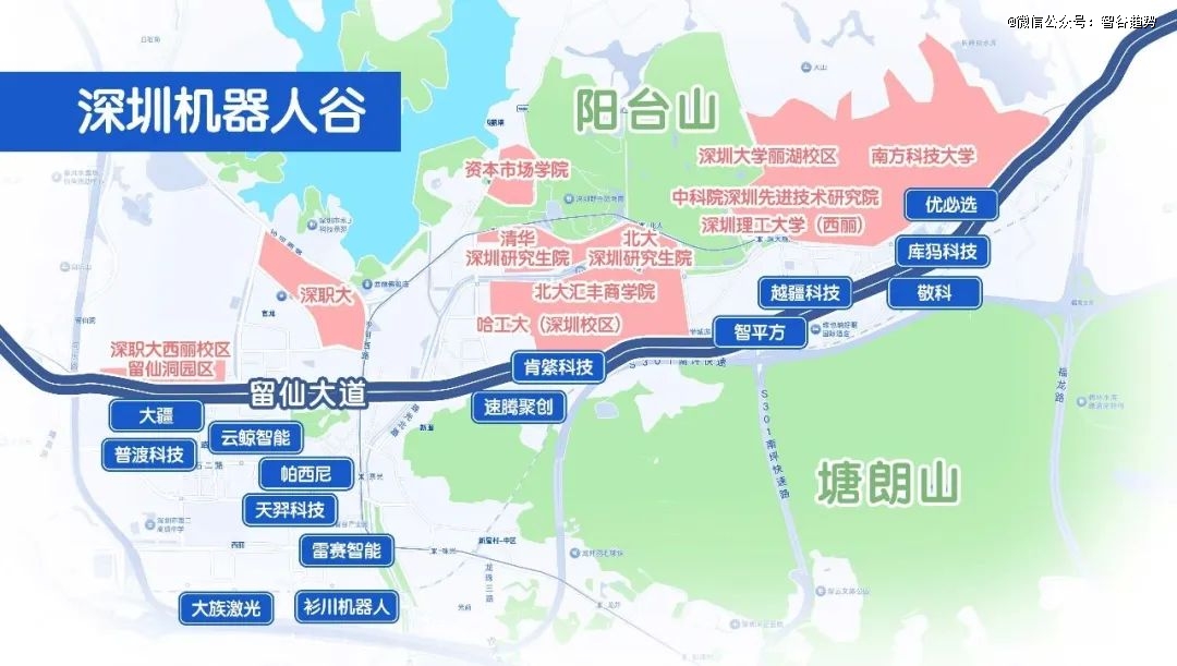 作为GDP最高、国家高新技术企业最多的城区,南山区的机器人产业尤为发达。相关企业集中分布于深圳阳台山和塘朗山之间的谷地,业界称之为深圳“机器人谷”。
