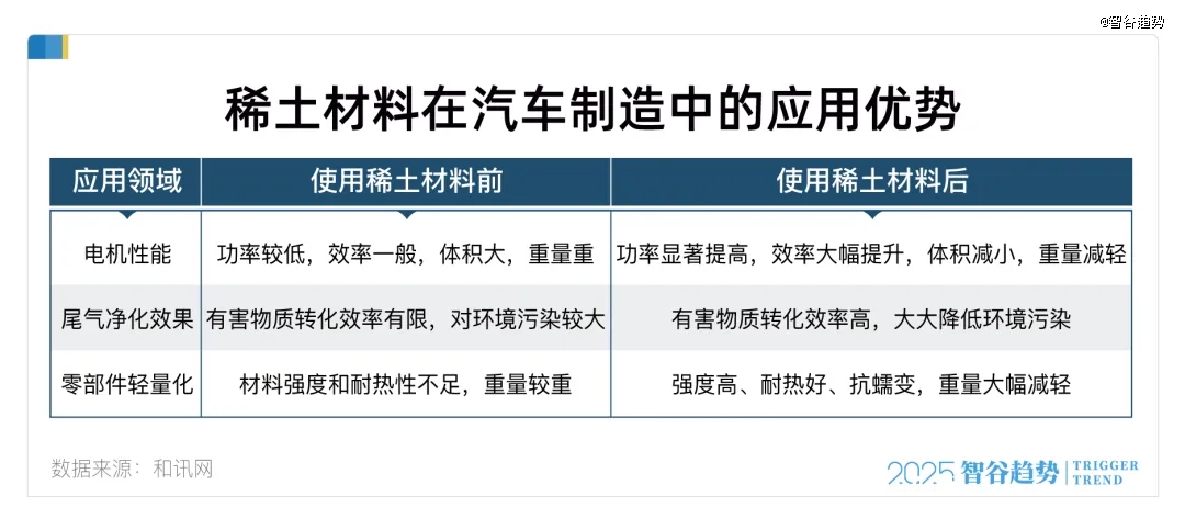 汽车行业有个说法,“无稀土,不成车”。在汽车电机中加入稀土材料,可大幅提升电机的功率和效率;在尾气净化催化剂加入稀土元素铈,可让提高尾气净化效率,减少环境污染;在轮毂等零部件中加入稀土材料,可以提升车身的强度和耐热性。