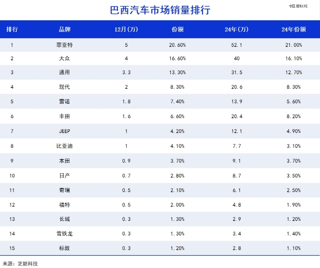2024年,比亚迪在巴西销售76811辆汽车,飙升328%,排名跃升至第8位,海鸥、宋Plus、宋Pro等明星车型在巴西、墨西哥、哥伦比亚等地也纷纷斩获了各种销量冠军。