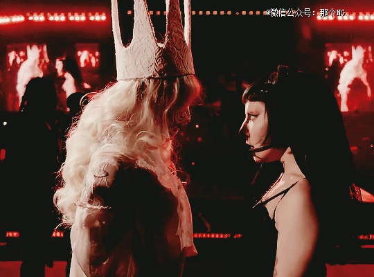 白衣皇后头戴高耸哥特王冠,代表旧时代的Lady Gaga;黑衣皇后则是站在当下的她本人,也是Stefani Germanotta(她的本名)。这是新旧两种人格的撕裂与对抗。