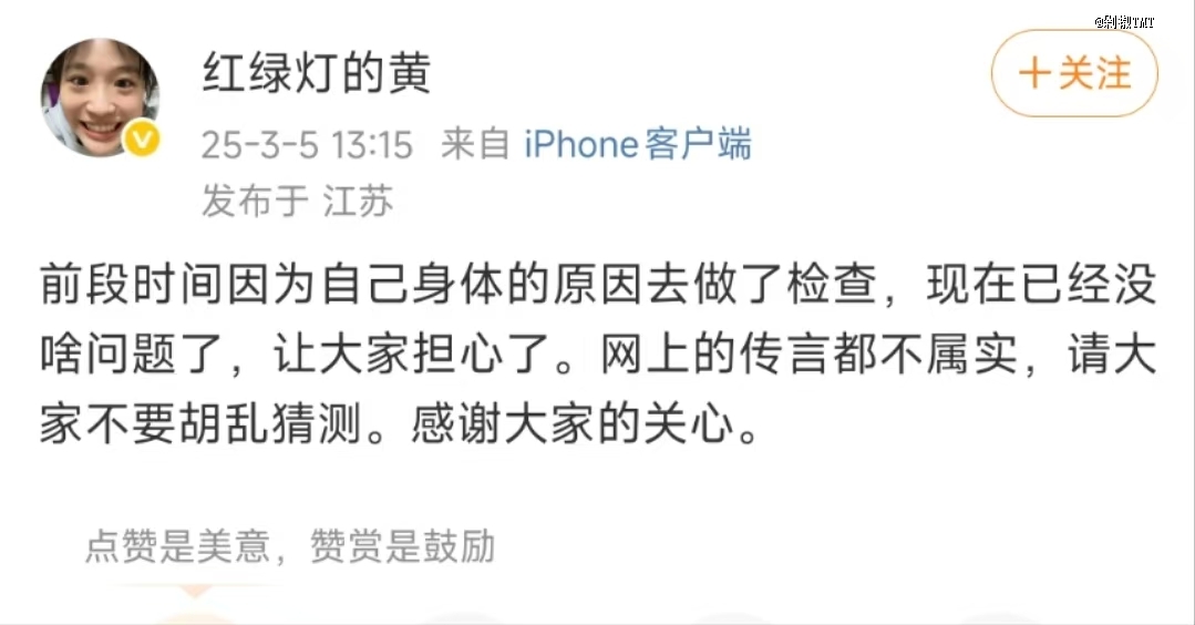 随后,小黄在微博上澄清了此事,表示自己前段时间因身体原因去做了检查,目前已无大碍,网上的传言都不属实,感谢大家的关心。